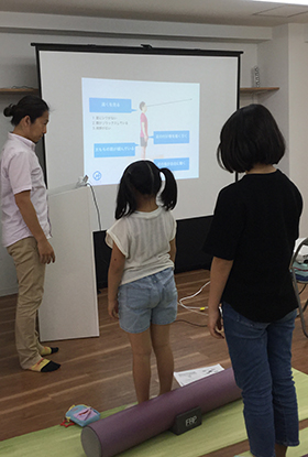 身体がふらつかない位置を体験したり、ローラーを使ってエクササイズが始まりました。